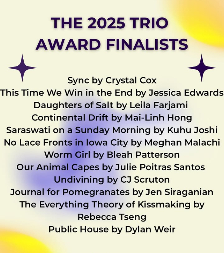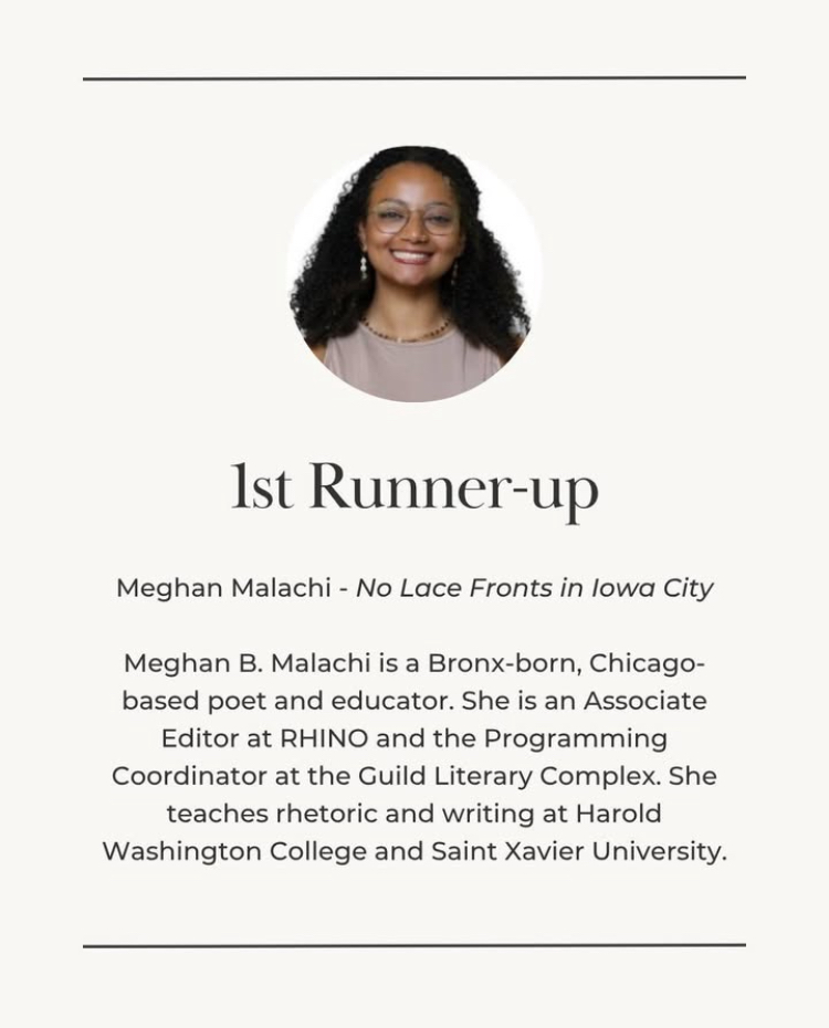 Meghan Malachi’s debut full-length poetry collection, No Lace Fronts in Iowa City, is a Trio Book Award finalist, a Gasher Book Award finalist, and a Hillary Tham Capital Collection finalist. No Lace Fronts in Iowa City was selected by Allison Joseph as runner-up to the 2024 Arthur Smith Poetry Prize and is forthcoming from Madville Publishing in 2026.